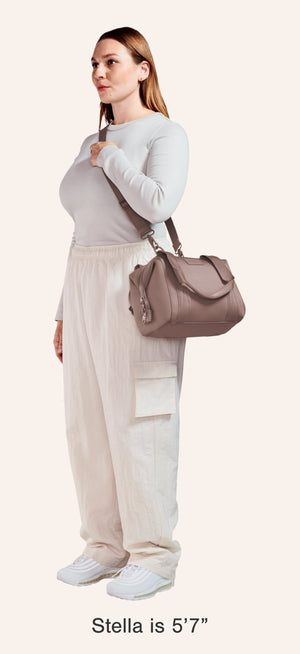 • small Landon Carryall in grey, displaying an exterior phone pocket